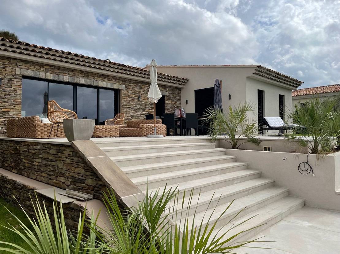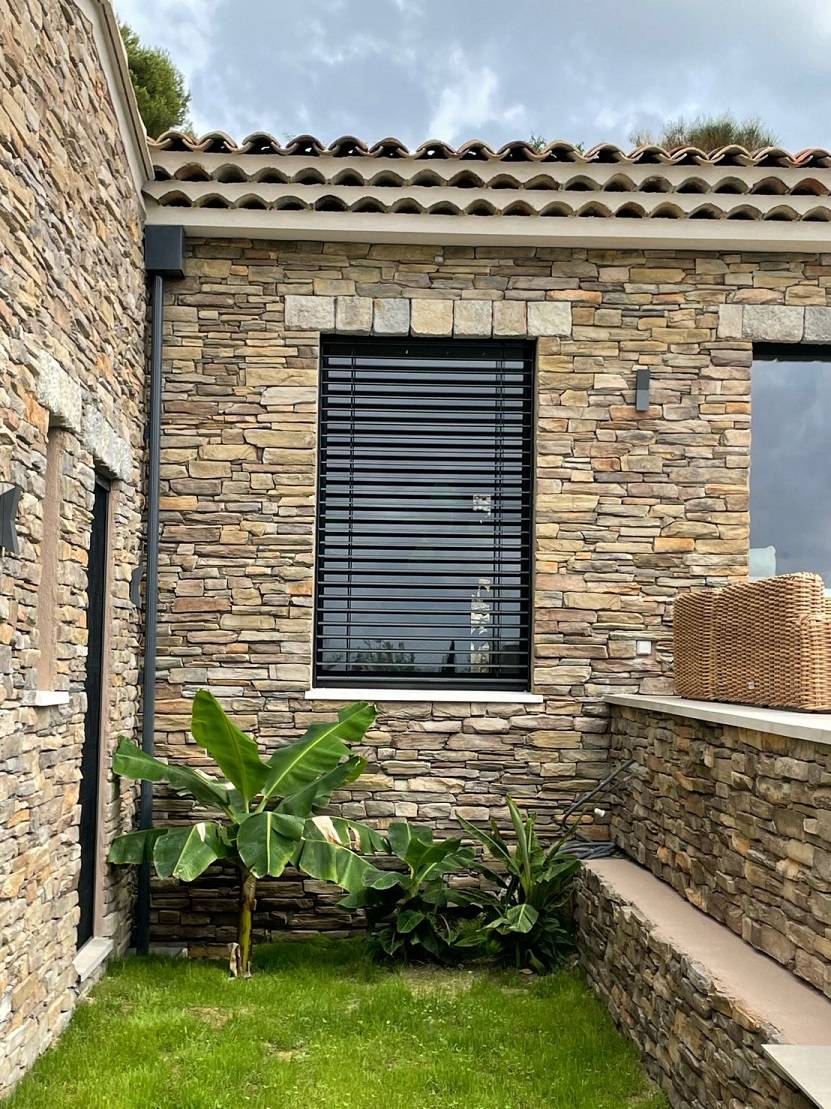 Le coffre demi-linteau pour réservation de volet roulant invisible en façade utilisé sur les ouvertures de cette villa à Aureille, dans les Alpilles, est un des produits spécifiques réalisés sur-mesure par la société Deco-ffrage.